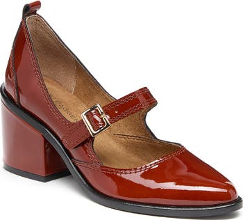An adjustable mary jane strap creates a retro aesthetic on a patent leather pump balanced by an almond toe and wrapped block heel.