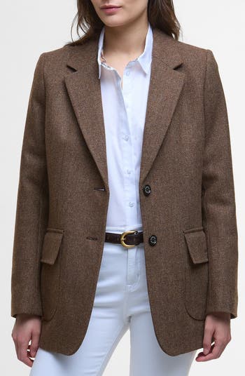 Patched elbows authenticate a timeless wool jacket closed with signature buttons.