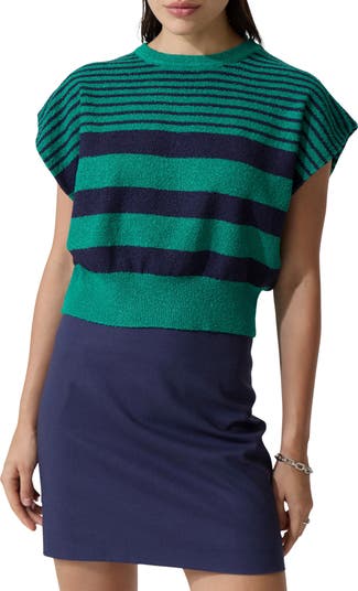 Variegated stripes enliven this lightweight sweater-vest updated with slight sleeves and a cropped, banded waist that shapes its boxy silhouette.