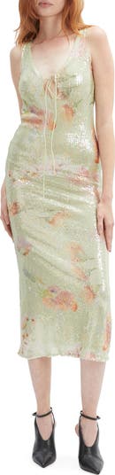 Shimmering sequins cover a figure-skimming midi with long, adjustable ties at the neck and back