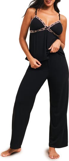 This knit pj set features a cami tank top with double-lined triangle cups, a supportive elastic band beneath the bust, romantic ribbon slot lace trim, and matching pants with an elastic waistband.