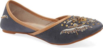 Shimmering sequins and intricate embroidery enrich an artisan-crafted flat designed for comfort with a cushioned footbed and flexible rubber sole.