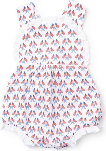 Girls' cross back sleeveless pima bubble with ruffles. Snaps secure the straps in back and three snaps in the stride. Gathered waist in the back. Coordinates with the Eden Dress. Made from 100% Peruvian Cotton.