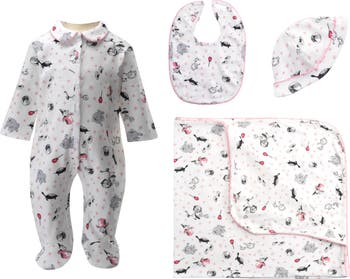 Welcome a new baby with the delightful Eloise Toy Print Footie Gift Set! This adorable four-piece set includes a cotton footie, along with a coordinating bib, hat, and soft blanket. Featuring playful illustrations by Hilary Knight from Kay Thompson's Eloise, this gift set is perfect for keeping your little one cozy and stylish. A charming and practical choice to celebrate a new arrival!