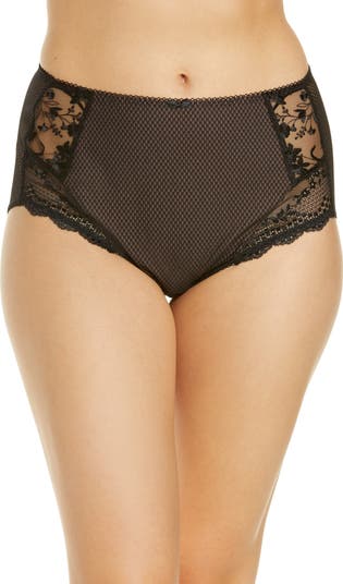 Colorful floral embroidery and diamond mesh play up the sweet aesthetic of these full-coverage panties.