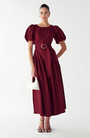 The Elona Midi Dressby WILLA is a sophisticated woven midi-length dress that captures refined elegance with dramatic volume and architectural design.
