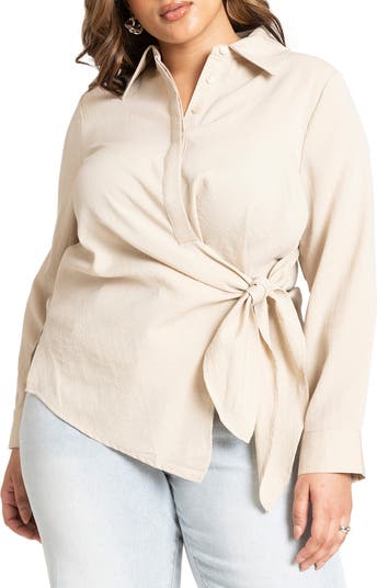 A tie at the waist adds chic asymmetry and a contemporary detail to a lightly textured woven shirt sporting a covered button placket.