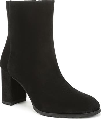 Minimal detailing brings maximum versatility to a dark leather bootie designed with an uninterrupted profile rising from the rounded toe to the flat topline. Perched on a curvy block heel, it features flexible rubber lugs on the tread to ground every look with traction and sartorial confidence.