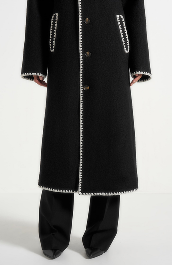 Contrasting whipstitch detailing defines this trench coat, bringing a modern edge to a timeless outerwear staple. Crafted from soft wool fabric, it delivers a premium finish with natural warmth, while a detachable belt allows for versatile waist definition. Marble feature buttons elevate the design with a polished statement accent, and functional front pockets ensure everyday practicality. Style with matching scarf to complete the look.