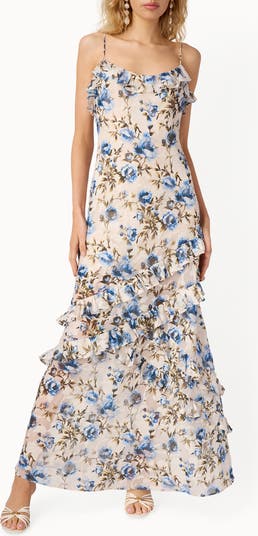 A delicate floral burnout pattern brings garden-inspired romance to this chiffon dress, where fluttering tiers of soft ruffles create sweeping cinematic movement.