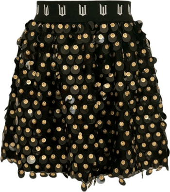Glamorous black and gold sequin skirt for kids, designed to make a bold statement with its striking oversized sequin embellishments. Elastic waistband sequin skirt with a stylish logo design, ensuring a snug yet comfortable fit for active days and special occasions. Ideal for parties, holidays, and special events, this skirt shines brightly under the lights, making it a must-have for any young fashionista’s wardrobe.