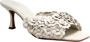 Tonal floral appliqués saunter over the upper and create a 3D effect on a faux-leather slide sandal featuring an angular square toe and tapered heel for stylish balance.