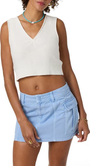 A rolled neck adds to the casual-cool vibe of a sleeveless sweater finished with a wide ribbed hem.