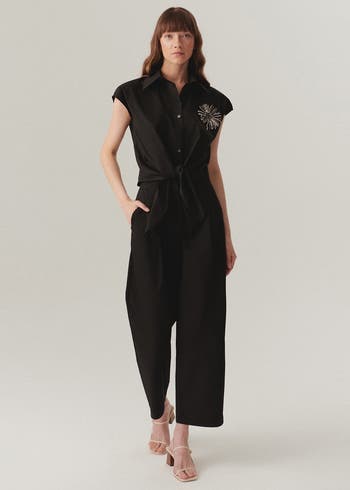 - The Polished Flowing Trousers in black offers a polished, versatile look. Breathable cotton keeps it comfortable through the day. It styles easily with shirts, knits, or simple tops for both casual and polished dressing.