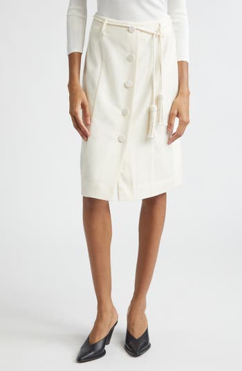 A row of covered buttons trace the front of this wool midi skirt shaped by back darts and cinched at the waist with a tasseled rope belt.