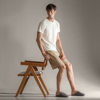 - The light shade of the T-shirt and slight relief on the fabric of the set resemble linen textiles with its distinctive texture.