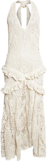 Crafted from netted string lace, this sheer, sensual halter dress brings a beachy aesthetic to the forefront. It's wrapped with crossover ruffles at the hips and slashed with a leg-baring front slit. Rooted in the vibrant spirit of Istanbul, the Siedrés collection is inspired by childhood memories under the Mediterranean sun.