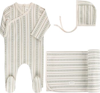 Soft, delicate tulip stripes in the sweetest vintage tones, the Linear Tulip Collection is made especially for baby. Thoughtfully designed in coordinating pieces, each style is crafted with a gentle stretch for the coziest, cuddliest fit. This baby layette set — the perfect take me home set — includes a coordinating kimono-style footie (Stretchy), matching bonnet, and blanket for a beautifully complete look.