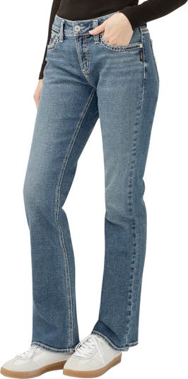 Perfect your casual-cool game in these mid-rise jeans made with a little extra room in the hip and thigh to hug your curves. An eased waistband keeps the midsection comfy, preventing digging even when sitting.