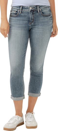 Stay comfy on sunny days in these stretchy denim capris made with an eased mid-rise waist, cuffed raw hems and extra room in the hips and thighs.