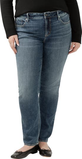 Designed for curvy figures, these stretchy straight-leg jeans offer a comfy fit with an eased mid-rise waistband and extra room in the hips and thighs.