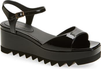 The platform wedge and thick sawtooth tread from Stella's Elyse line lifts this sandal ankle-strap sandal handcrafted from animal-friendly faux patent leather.