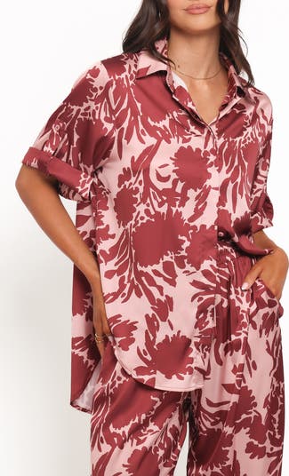 An oversized silhouette maintains the relaxed vibe of a woven shirt patterned with a resort-ready floral print.
