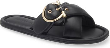 Inspired by the wrought‑iron gate of Ferragamo’s original Florentine headquarters, a statement-scale Gancio buckle gleams atop this cushioned Italian-leather slide sandal with a softly padded strap.