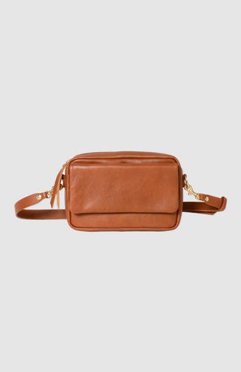 Ema Everyday Crossbody in full-grain leather with brass hardware, built-in wallet, hidden phone pocket, back zip pocket, and removable strap.
