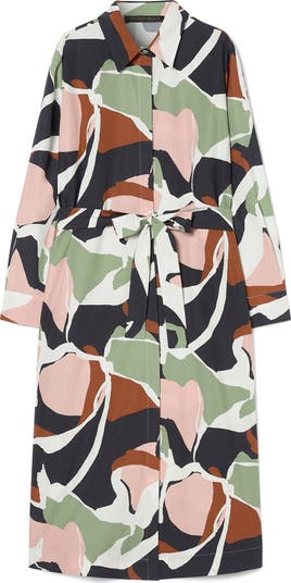 A bold abstract print splashes across a crisp cotton-poplin shirtdress that's cinched with an optional tie belt.