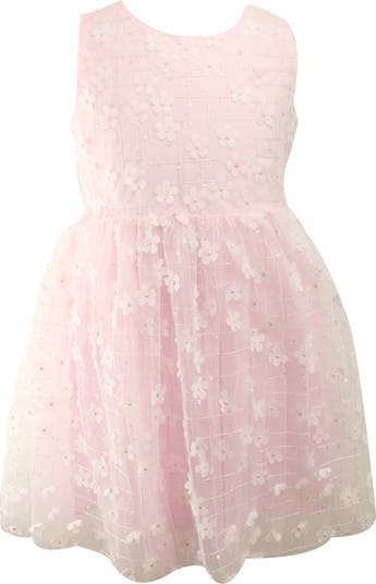 Dimensional flowers and a sprinkling of tiny sequins highlight this sweet pink dress with a check-embroidered organza overlay.