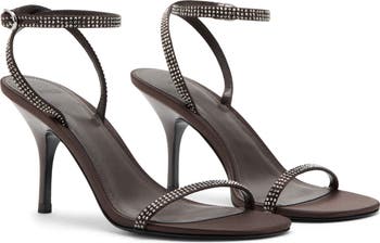 Rows of tiny crystals shine at the straps of a sleek sandal lofted by a tapered heel.