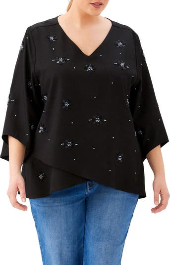 A front crossover hem dips lower in back to enhance the fluid movement of this fluttery top designed with sequin-embroidered flowers sparkling at the front.