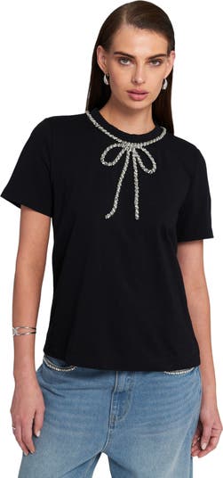 Sparkling rhinestone bow detail adds a playful, polished touch to the neckline Soft cotton fabric offers breathable comfort for all-day effortless wear Classic short-sleeve silhouette with a dressed-up twist for everyday glam Designed to elevate your casual look without sacrificing comfort Pairs effortlessly with denim, skirts, or trousers for a polished and versatile everyday look. Machine-washable design keeps its shape and shimmer with easy care