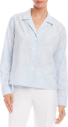 Pretty floral embellishments pop against the yarn-dyed stripes on this refined button-up shirt fashioned in a relaxed fit.