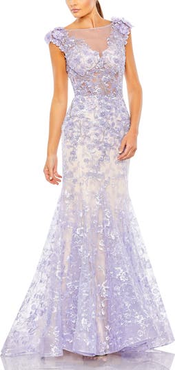 This enchanting dress features floral embroidery, crystal stems, sequins, and 3D flowers at the shoulders. Designed in a trumpet silhouette with a bateau neckline and sheer bodice.