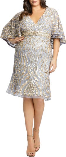 This chic V-neck cocktail dress features metallic gold sequins, a hand-beaded belt, and an elegant cape back, perfect for any sophisticated event.