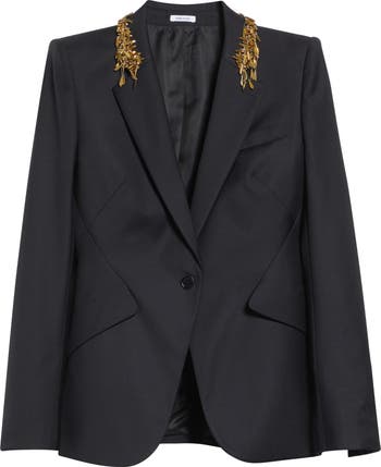 Bronzy leaves drip from the collar of this fitted wool jacket fastened with a one-button closure. It's ingeniously tailored such that the pocket flaps emerge seamlessly as an extension of a side panel—no welt seams involved—bringing a sleek look to this modern style.