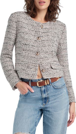 Subtle sequin detailing and oversized goldtone buttons add to the free-spirited vibe of a collarless work-to-weekend jacket that's gently fitted and cropped to highlight your waist.