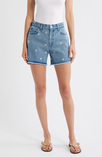 A sprinkling of embroidered flowers brings blooming style to these cutoff shorts crafted from nonstretch denim.