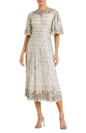 Enhance your elegance with the Flounce Sleeve Midi Dress. The illusion high neckline and beaded waist detail beautifully accentuate your figure, making it perfect for any special occasion.