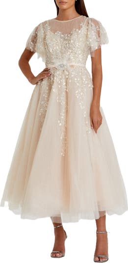 Make an impression in our Embellished Flutter Sleeve Bow Waist A-Line Dress. With flutter sleeves and a stylish bow at the waist, this dress is perfect for any occasion.
