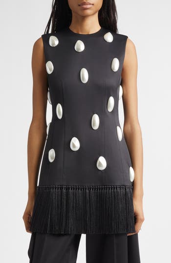 Lee Hyemee masterfully blurs the line between art and fashion with this runway-featured tunic cut from sleek satin traced with thick fringe and dotted with sculptural faux-pearl embellishments.