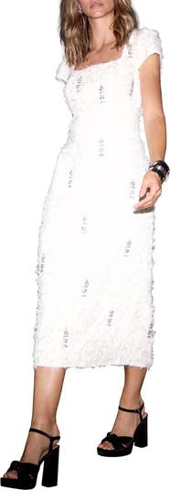 Jacquard dress in a midi silhouette featuring a square neckline, cap sleeves, embellished detailing with a zip fastening through the back.