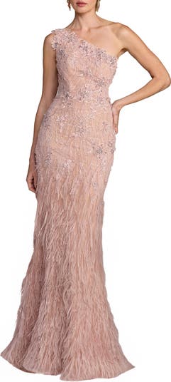 Elegant and statement-making, this one-shoulder gown features floral embroidered lace with hand-applied beading and a feathered skirt for dramatic movement.