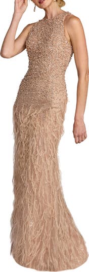 Striking and glamorous, this embellished gown features a sleek column silhouette and a dramatic feathered skirt for unforgettable black-tie elegance.