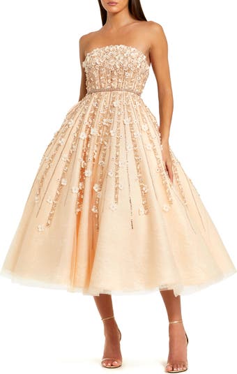 This strapless lace midi ballgown exudes elegance with intricate embellishments, a delicate lace overlay, and a flattering A-line silhouette—perfect for any special event.