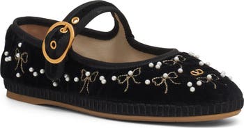 Ballet-core style gets a glamorous update with this ballerina-inspired mary jane made of sumtuous velveteen embellished with pearly beads and metallic bow embroidery.