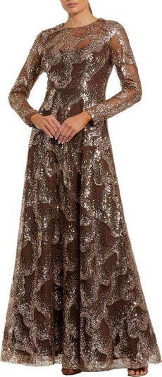 Sequin long-sleeve gown with sheer illusion detail, fitted bodice, and flowing A-line skirt—perfect for black-tie events or formal evenings