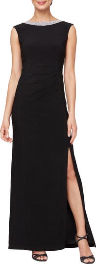 Twinkling beads shimmer across the neckline of this elegant gown fixed with a leg-baring skirt slit.